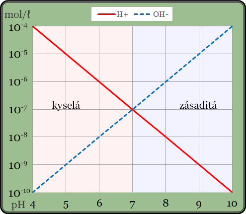 Svislá osa grafu udává molární koncentraci daného iontu a vodorovná hodnotu pH. Je zřejmé, že známe-li koncentraci jednoho z iontů, koncentrace druhého je tím daná. V praxi měříme koncentraci vodíkových kationtů – protonů. Je-li koncentrace protonů vyšší než 10-7 M (např. 10-6 M), což současně znamená, že je vyšší než koncentrace hydroxidových aniontů, pak je voda kyselá. Naopak je-li koncentrace hydroxidových aniontů vyšší než 10-7 M, je jich více než protonů a voda je zásaditá. Je-li koncentrace obou iontů stejná, tedy 10-7 M, voda je neutrální.