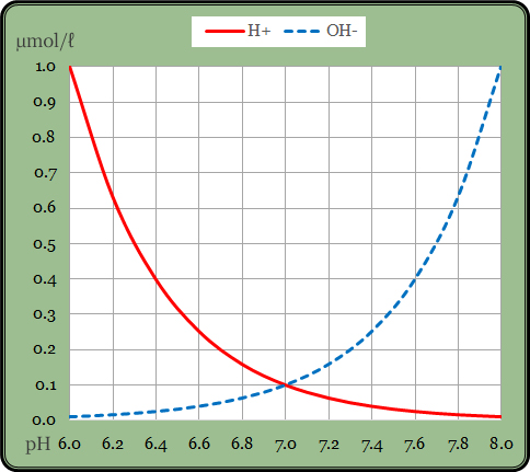 Vodorovná stupnice udává hodnotu pH a svislá koncentraci daných iontů v mikromol na litr (1 µM = 10-6 M; 1 µM je jedna milióntina mol na litr). Na rozdíl od Grafu 1, v tomto grafu není svislá stupnice logaritmická, ale lineární, a znázorněným výsledkem pak není přímka, nýbrž „realistická“ křivka. Molární koncentrace protonů při hodnotě pH=6 je 1 µM, při pH=7 je 0,1 µM a při pH=8 činí 0,01 µM. A třeba při oblíbené hodnotě pH = 6,6 je koncentrace protonů 10-6,6 M = 0,25 µM.