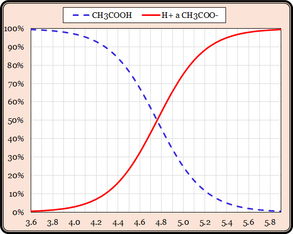 Vodorovná osa označuje hodnotu pH, svislá osa podíl obou forem na celkovém obsahu kyseliny. Dejme tomu, že na začátku má roztok hodnotu pH = 3,6. Kyselina octová v něm obsažená prakticky nedisociuje a ke kyselosti roztoku (tedy koncentraci protonů H+) nijak nepřispívá. Když do takového roztoku přidáváme silnou zásadu, hodnota pH bude stoupat.