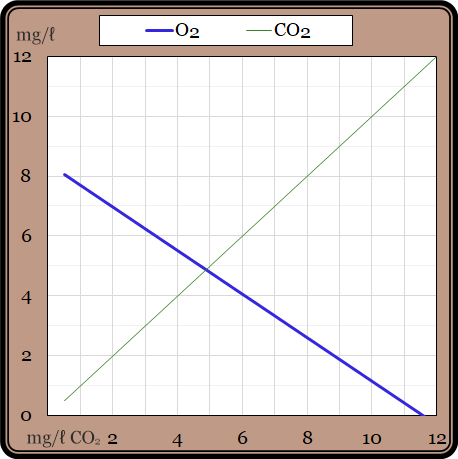 A tak na grafu vidíme, že „neživá“ voda bez vodních organismů obsahuje asi 8 mg/l O2 a 0,5 mg/l CO2. V závislosti na přítomnosti organických látek se v „živé“ vodě rozmnoží organismy a respirují – obsah O2 klesá, obsah CO2 stoupá. Dosáhne-li koncentrace CO2 6 mg/l, obsah kyslíku poklesne na úroveň 4 mg/l, a to je již prostředí dosti nepříznivé pro život ryb i vyšších rostlin. A při koncentraci CO2 10 mg/l činí obsah O2 jen 1 mg/l. To pak je spíše jen páchnoucí stoka.