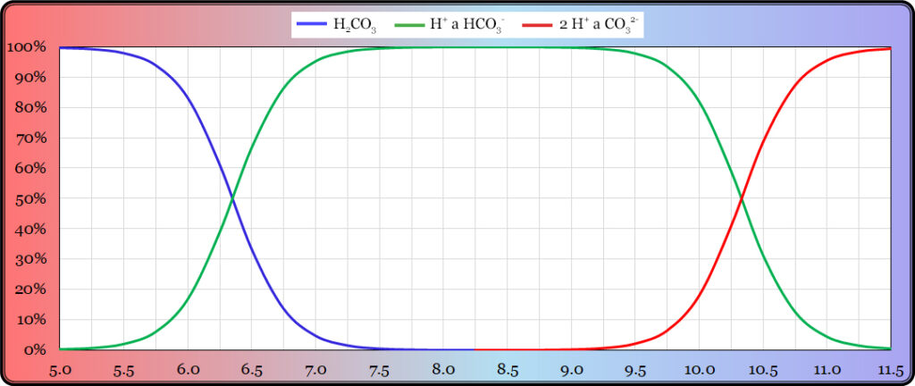 H2CO3 <–> H+ + HCO3– <–> 2 H+ + CO32-