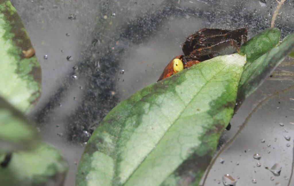 K rozmnožování se mají zvířata pravděpodobně až po roce života. Námluvy a páření jsem nikdy nepozoroval, ale samice po jednom páření může uchovat spermie i na další snůšky (měl jsem samostatně samici, která měla 2x mláďata a samce potkala naposledy několik měsíců před první snůškou). Interval mezi snůškami téže samice byl půl roku. Samice nosí vajíčka do jejich vylíhnutí, přibližně měsíc, poté se již o mladé nestará. Mláďat jsem měl nejvíc v jedné snůšce přes 50.