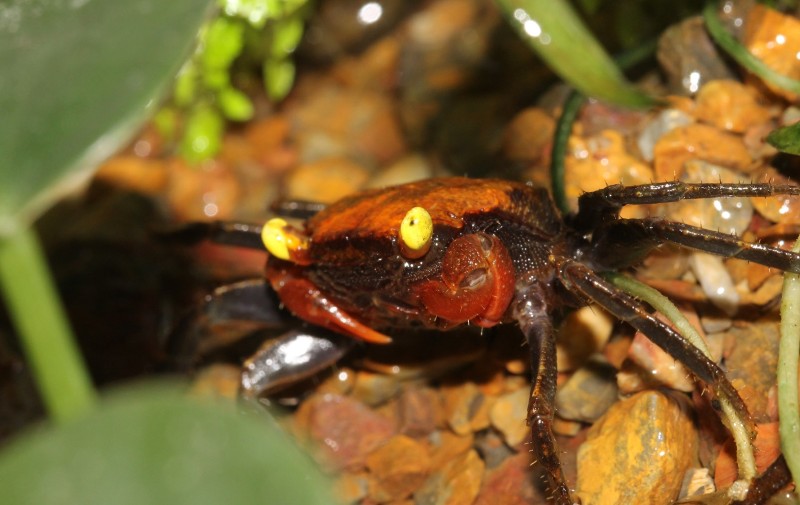K chovu používám terária 30 x 20 x 30 cm (a také větší, 40 x 40 x 50 cm) s cca ¼ plochy vody, zbytek tvoří souš. V teráriích této velikosti chovám páry a trio, v jednom odchovávám mláďata. Teplota krabům stačí pokojová (22–24 °C), osvětlení nehraje zásadní roli, ale je vhodné přisvítit kvůli rostlinám.