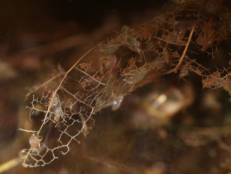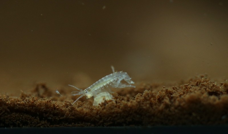 Zajímat se však musíme o substrát. Hyalelly se dobře cítí, pokud se mohou schovat před světlem. Používají se hrubé biomolitany či jiné porézní materiály, funguje i hrst hrubého štěrku apod. V laboratoři se jako substrát používá bavlněná gáza nebo papírové utěrky. Já osobně pak dodám, že ať už je v nádrži holé dno, vrstva štěrku či oblázků nebo biomolitan, vždycky na to hodím ještě hrst dubového listí a pravidelně ho doplňuju. Listí představuje nejen přirozený úkryt, ale i zdroj potravy. Blešivci ho rozmělní na vrstvu detritu, který zásadně neodkaluji; naopak detrit odjinud (či kal z filtrů) přilévám.