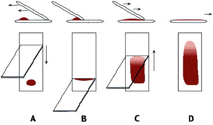 Náter pripravujeme podobným spôsobom. K spodnému okraju sklíčka nanesieme kvapku suspenzie (krvi, exsudátu, bakteriálnej suspenzie a pod.), opatrne priložíme hranu druhého sklíčka ku kvapke, čím sa nám roztiahne po celej šírke sklíčka. Rýchlym ťahom po podložnom sklíčku zhotovíme náter (obr. 5.). Po vyschnutí preparát fixujeme.