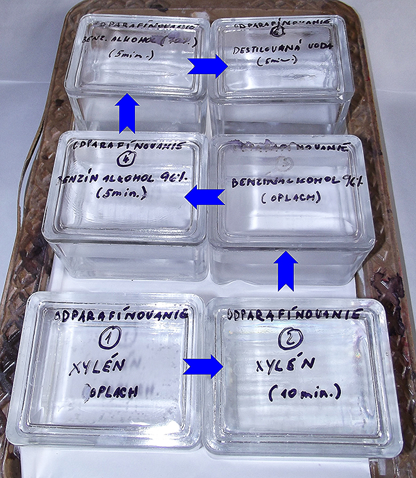 - Odvodnenie vzostupnou radou alkoholov (70% alkohol – 1 min., 96% alkohol – 1 min.)