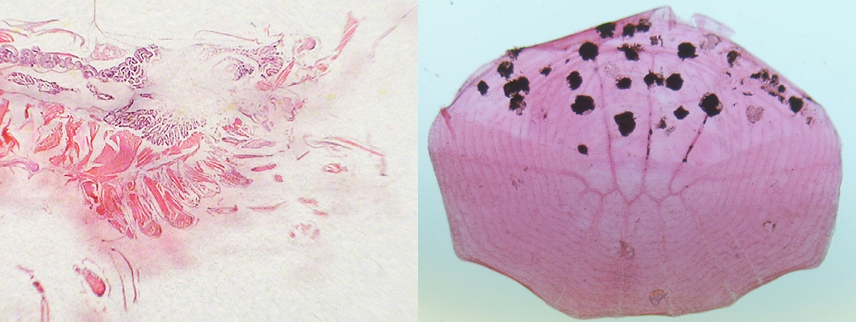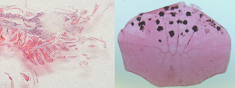 vpravo šupina (celá) Trigonostigma heteromorpha s viditeľnými pigmentovými bunkami (zväčšenie 50x).
