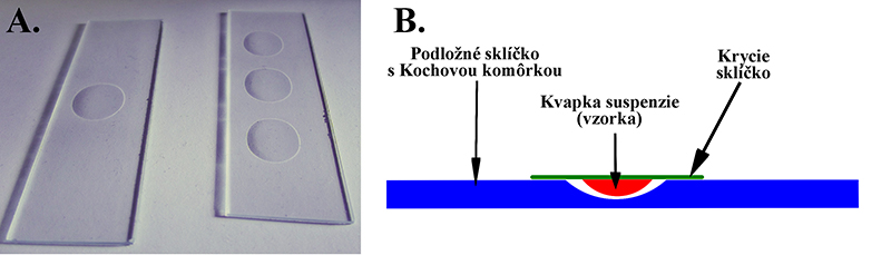 Pri tomto spôsobe budeme potrebovať špeciálne podložné sklíčko s vybrúsenou komôrkou (tzv. Kochova komôrka) (obr. 2.), prípadne si môžeme komôrku pripraviť prilepením „krúžka“ napr. z odrezanej rúrky (vznikne tzv. Böttcherova komôrka) na bežné podložné sklíčko. Pri tejto druhej komôrke si môžme v domácich podmienkach pomôcť improvizovane napr. pomocou nerezovej podložky.