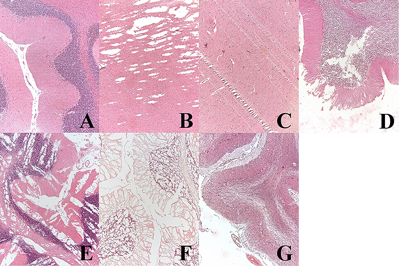 G) tkanivo zmenené patologickým procesom (mozoček, H&E, 50x).