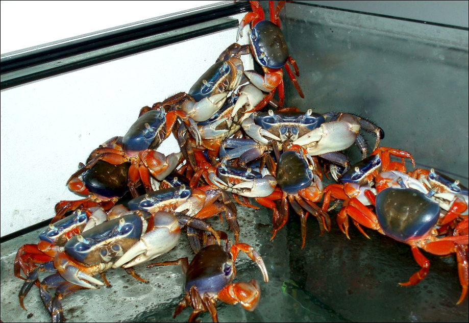 Suchozemští krabi Cardisoma armatum se pokoušejí uprchnout z karanténní nádrže ve velkoobchodu.