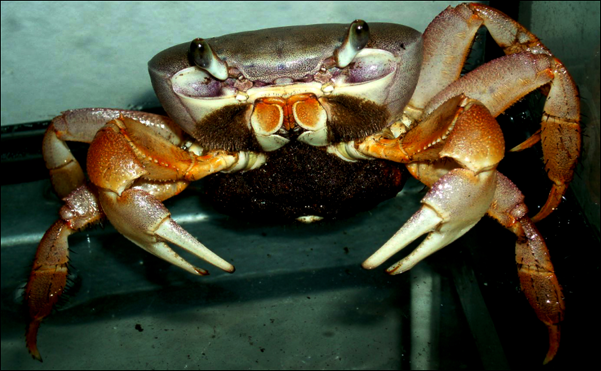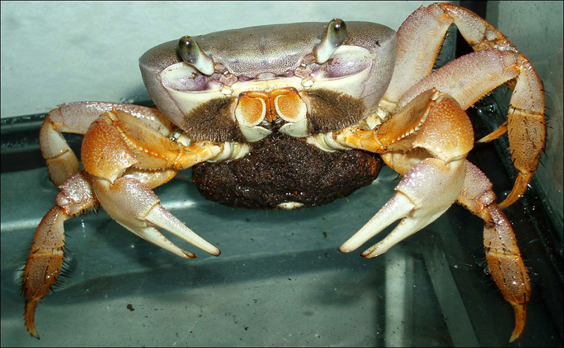 Gravidní samice druhu Cardisoma armatum se snůškou vajíček.