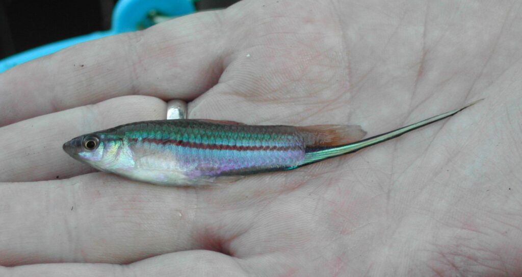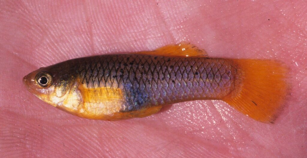 Mečovka zelená (Xiphophorus hellerii), samec.
